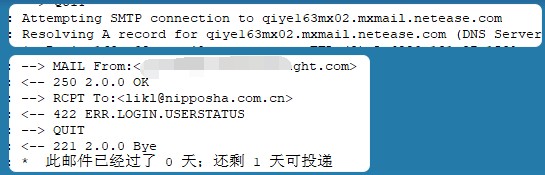 从8月份开始,就发现网易的邮箱出现这样那样的问题,免费邮箱使用FOXMAIL等登陆,时不时出现了-ERR Unable to log on,输入了正确的密码,也还是弹出一样的窗口,但是使用WEBMAIL登陆,一切都是正常的。过一段时间再次登录,又好了,间歇性抽风问题。另外网易企业邮箱,也一样出现这样的问题,当外部发信给网易企业邮箱的时候,有时候会出现ERR.LOGIN.USERSTATUS的问题,或者类似这样的其它问题,重发几次或者发送到其它IP的时候,邮件又正常了,有可能是部分接收邮件的MX机器出现了BUG或者故障等。