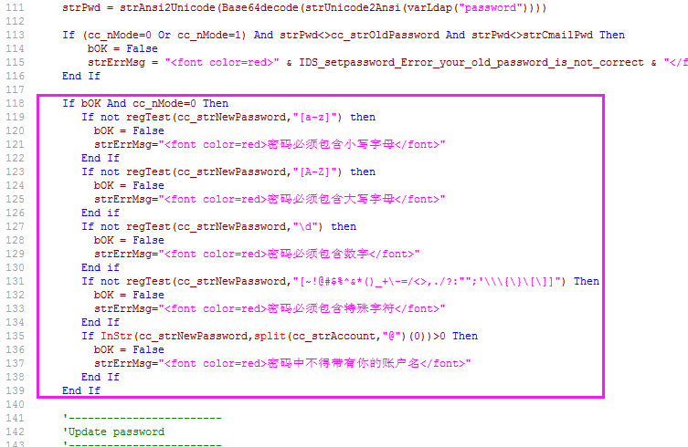 DBMAIL是一个不错的软件,居于ASP的WEBMAIL。鉴于目前盗号扫描的实在太猖狂,所以强制用户密码强度是很有必要的。下面的这个功能就是强制用户必须使用强度密码,功能其实很简单,就是一个正则表达式去检测。